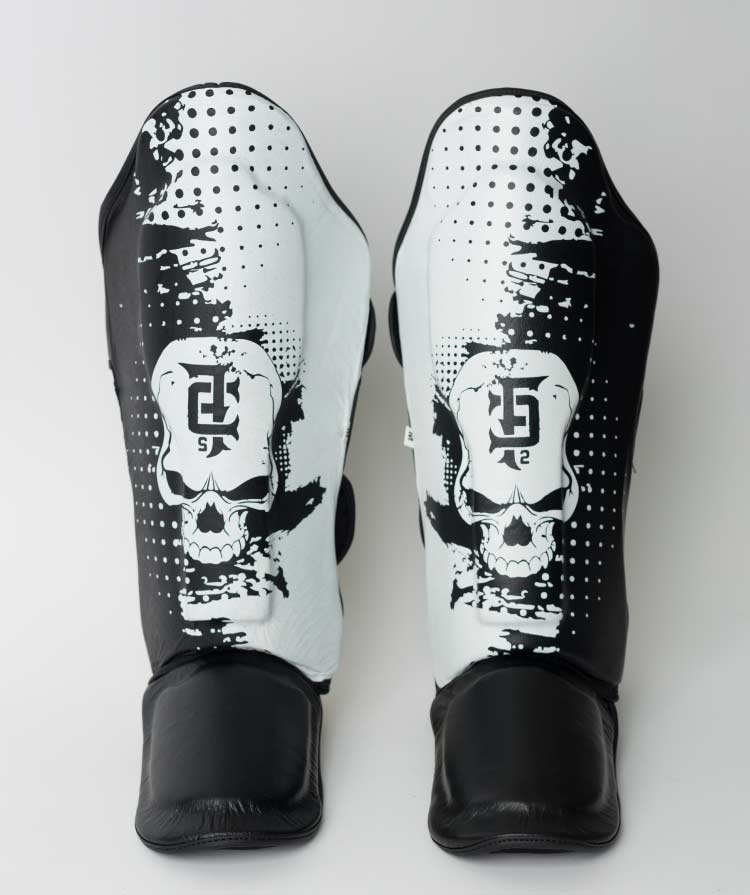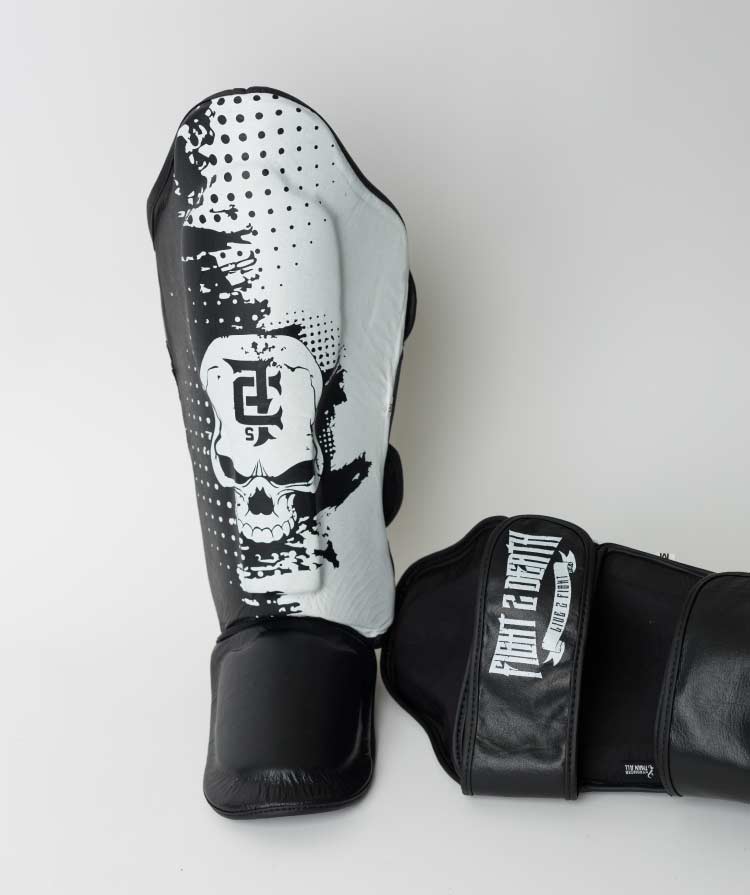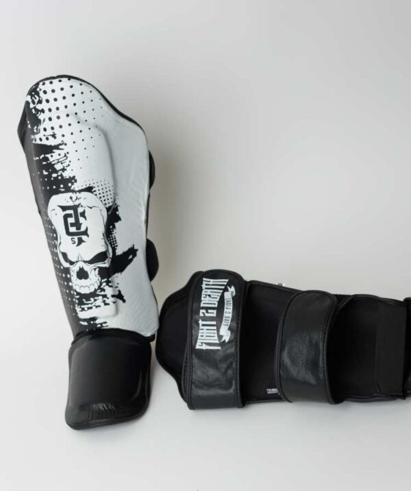 Excellent for TKD, Mixed Martial Arts (MMA), Kickboxing, Muay Thai, and general combat training and sparring. Black and White with Skull logo. Fight 2 Death super strong and comfortable shin guards.